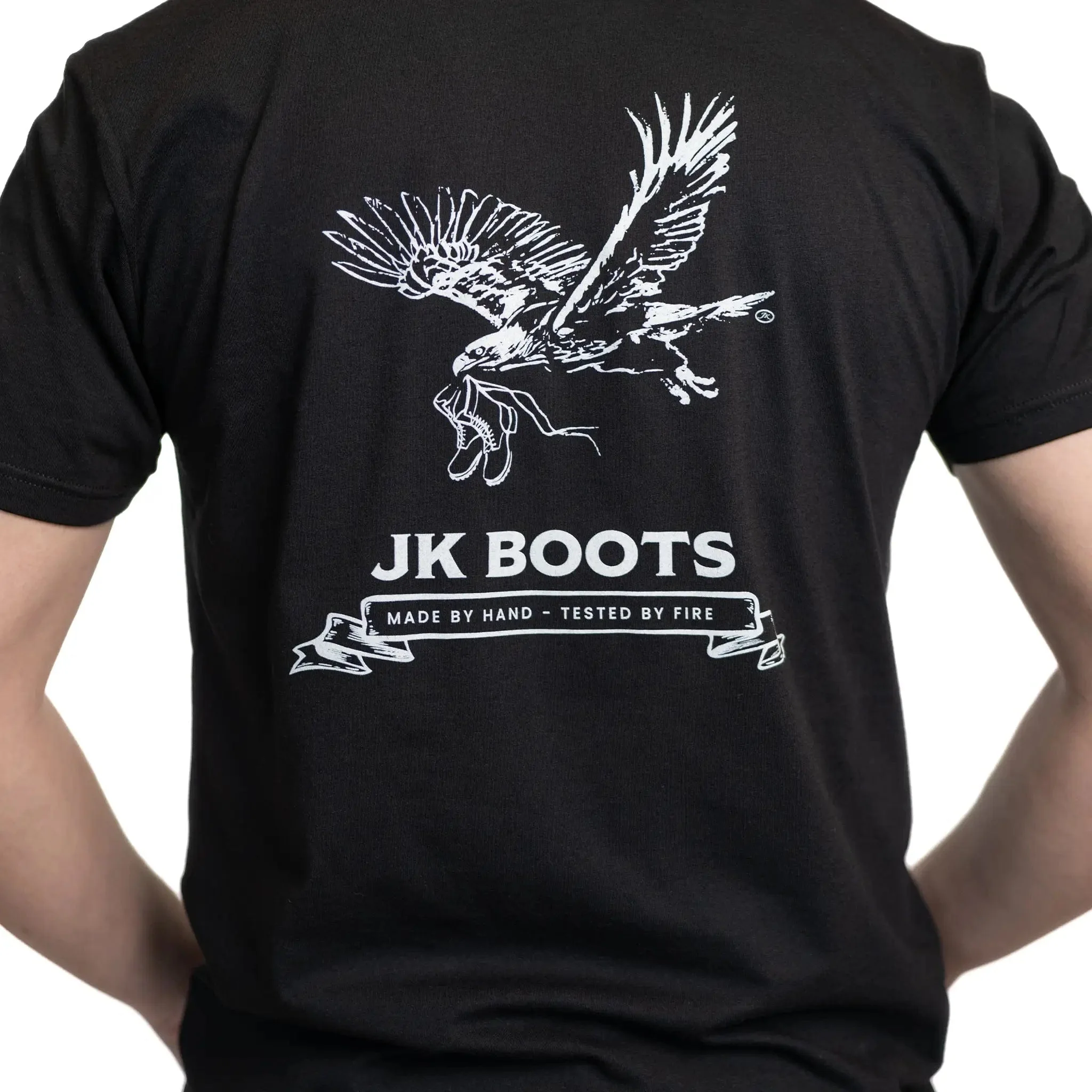 Introducing our "Catch of the Day" T-Shirt, where rugged style meets ultimate comfort. This tee showcases a hand-drawn eagle soaring over the back, clutching a pair of USA-made JK Boots - a symbol of strength and freedom.